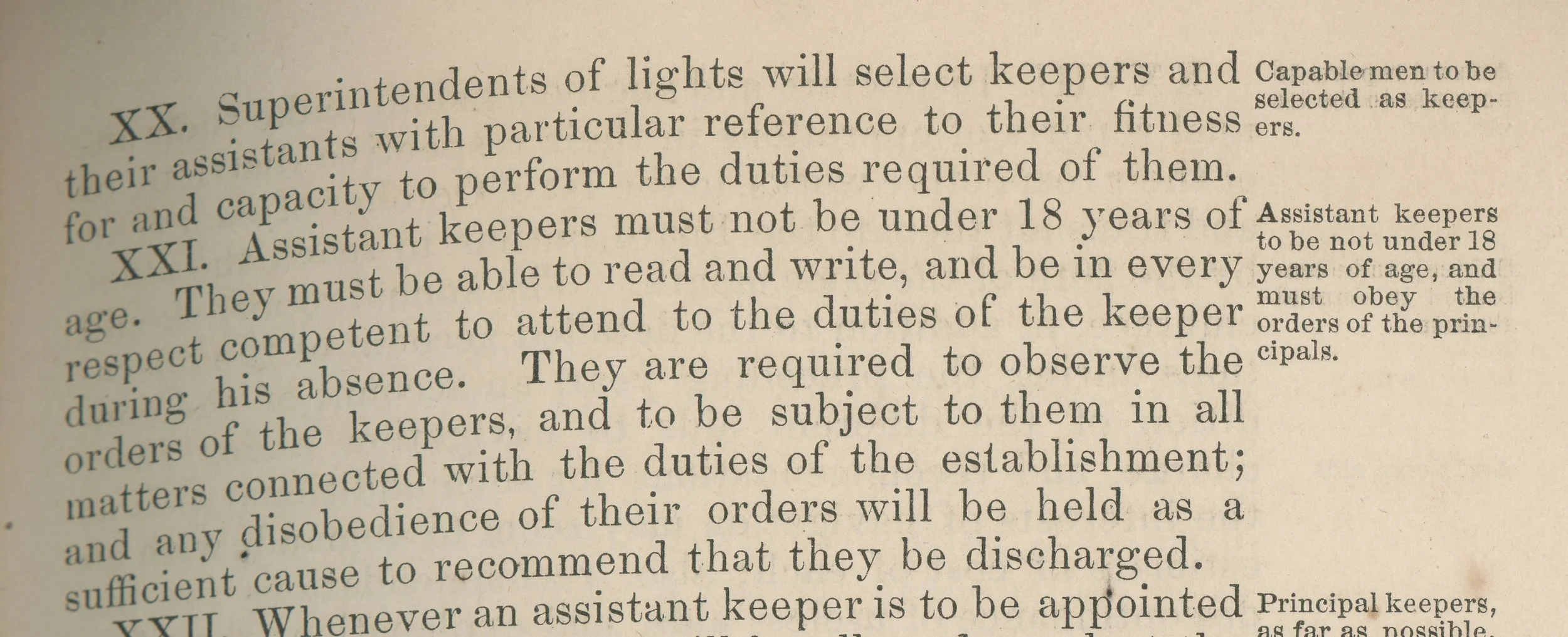 The Board implemented new types of towers, lights, and lenses, and one of their first major technological advancements was the purchase and installation of Fresnel lenses in nearly all lighthouses across the US. They also updated the instructions published for keepers and mandated that all keepers be able to read and write in order to read their instructions and file reports.